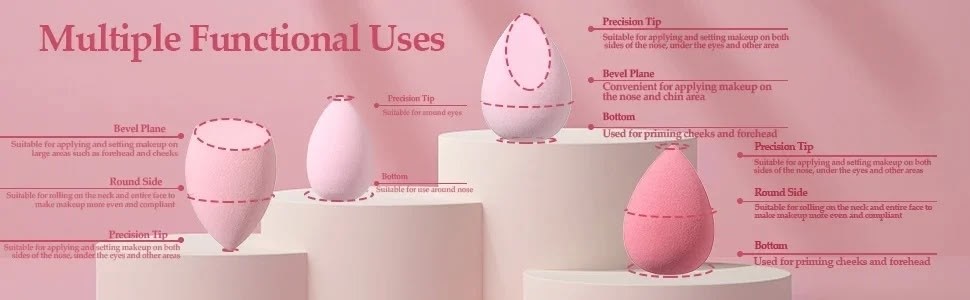 Для нанесения косметики рекомендуется использовать различные формы спонжей в зависимости от участка кожи лица или шеи Сначала определите зону, затем выберите форму спонжа, далее, в зависимости от текстуры средства, смочите спонж водой или оставьте его сухим для использования Если вам нужно нанести крем на труднодоступные места, используйте спонж в форме капли, скошенным спонжем удобно наносить макияж на шею, подбородок, скулы, лоб Разные размеры наших спонжей помогут вам тщательно проработать уголки глаз, веки, крылья носа Спонжи подходят для растушевки косметических средств различных текстур: влажным спонжем можно наносить жидкие и кремовые текстуры, сухим спонжем сыпучие средства.