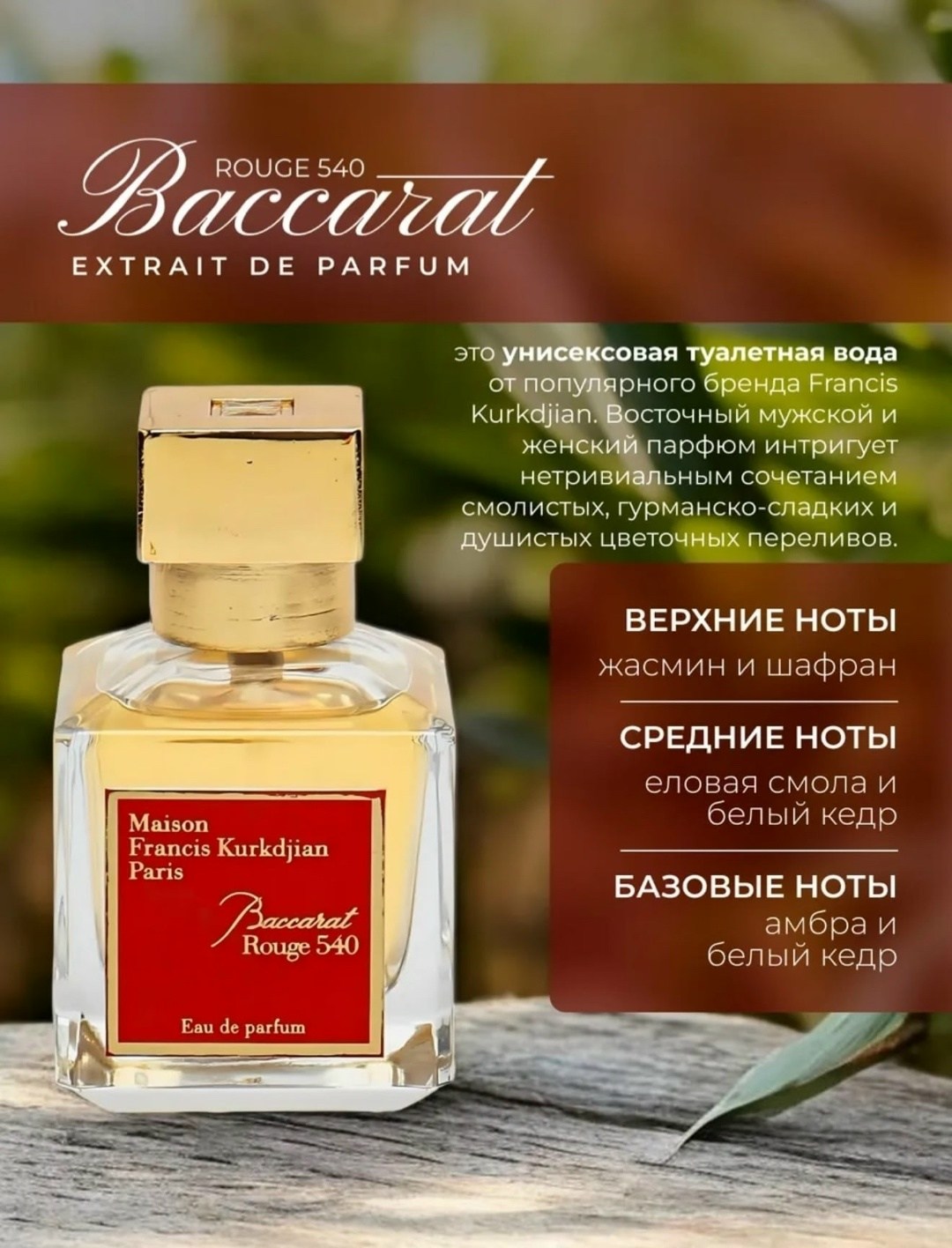 Это эксклюзивный аромат, который олицетворяет собой сочетание роскоши и изысканности Этот цветочно-восточный аромат, созданный для особых моментов, подарит вам неповторимое ощущение благородства и утонченности Состав аромата включает в себя ноты манго, масла шанель, хлопка и кожи, что делает его идеальным выбором для тех, кто ценит уникальность и глубину аромата Baccarat rouge 540 это не просто духи, это символ стиля и вкуса, который будет идеальным подарком для себя или близких Парфюм для женщин это не просто аромат, а отражение индивидуальности Туалетная вода создана для тех, кто ценит изысканные и стильные женские духи Парфюм женский подчеркивает элегантность и утонченность, делая каждый день особенным Женский парфюм подходит как для повседневного использования, так и для особых случаев Духи для женщин предлагают широкий выбор ароматов, которые оставляют незабываемое впечатление Парфюмерная вода имеет стойкий шлейф, который сохраняется на протяжении всего дня Среди разнообразия ищите духи для девушек с яркими нотами, а также более глубокие и насыщенные ароматы для зрелых дам Любой женский парфюм подчеркивает индивидуальность своей обладательницы Использование высококачествонных ингредиентов делает парфюмерную воду долговечной и насыщенной Женские духи всегда актуальны в качество подарка или просто чтобы побаловать себя Женская туалетная вода лумине идеально подходит для любого возраста Духи maison francis kurkdjian paris.