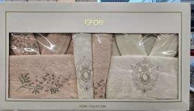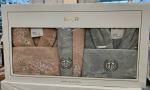 Мужские и женские махровые халаты вместе с полотенцами.