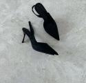 Черные туфли слингбэки с острым носом и золотым металлическим мыском на высоком тонком каблуке-шпильке.