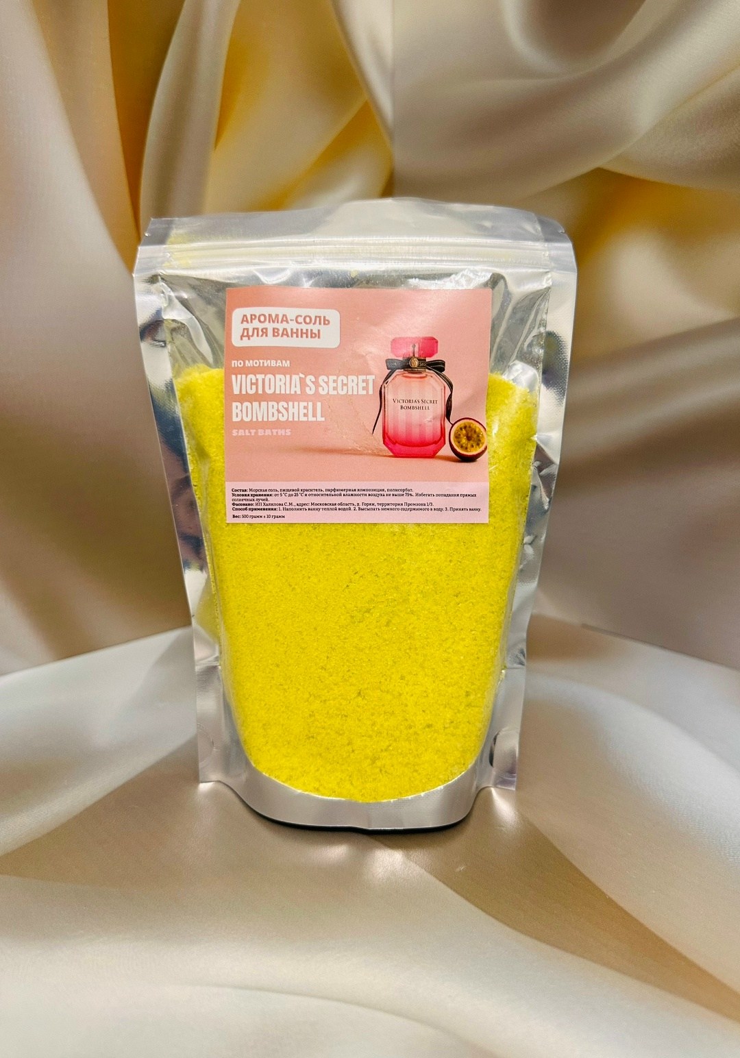 Состав: морскал соль, пищевой краситель, парфюмерная композиция, полисорбат условил хранения:от5 сдо25си относительной влажности воздуха не выше75 Избегать попадания прямых солнечных лучей.