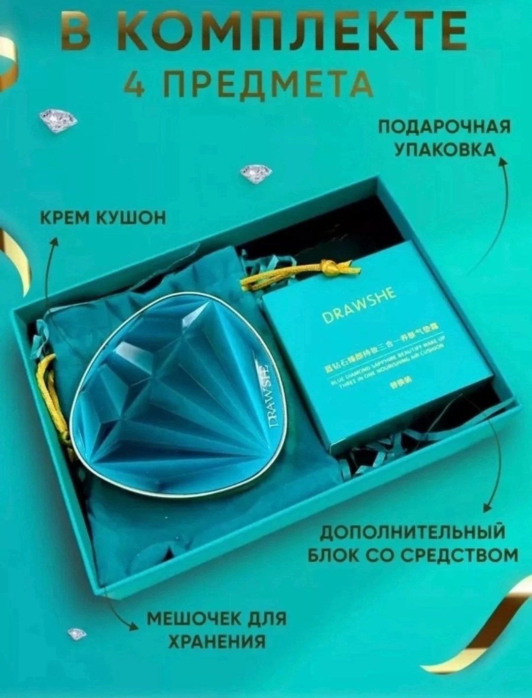 Бриллиантовый кушон уникальный косметический продукт, который помогает быстро скрыть мелкие несовершенства кожи и создать безупречный оттенок Тональный крем-кушон ложится тончайшим невесомым слоем, подстраивается под исходный оттенок кожи, обеспечивает ощущение лгкости и комфорта в макияже весь день Кушон объединил в себе достоинства: консилер, bb- крем, тональный крем, пудру, базу под макияж Кушон обладает маскирующим средством Маскирует черные точки, акне, скрывает темные круги под глазами, морщины, покраснения, пигментацию, а также другие несовершенства Тональная основа не только маскирует несовершенства, но и увлажняет и питает кожу при этом не оставляет блеска Bb крем подстраивается под тон вашей кожи Крем для лица можно использовать как базу под макияж Кушон водостойкий и воздухопроницаемый (не забивает поры) Не создает ощущение маски для лица Подходит для всех типов кожи: сухой, жирной комбинированной Для равномерного нанесения в комплекте идет мягкий спонж Обладает повышенной стойкостью Увлажняет и защищает кожу на протяжении целого дня Предотвращает сухость и шелушение Благодаря легкой текстуре и продуманному способу нанесения тон: не потечет не скатается не забьется в поры В комплекте идт подарочная коробка,, кейс с зеркалом дополнительный 1 блок с средством.