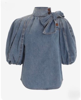 Джинсовая блуза с выразительным характером: объмные рукава, аккуратные декоративные швы и высокий ворот с изящным бантом создают эффектный силуэт Мягкий деним красиво держит форму, а пуговицы на плече добавляют стильный акцент.