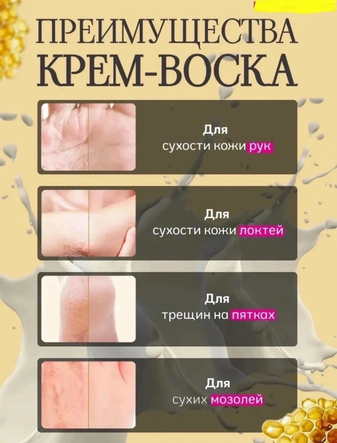 Воск -средство от трещин для очень сухой кожи Входящие в состав продукта масла (кокосовое, пальмы, ши, шалфея) питают, увлажняют кожу, придают ей гладкость и нежность Дпантенол, экстракты ромашки и подорожника оказывают заживляющее действие Пчелиный воск нейтрализует воспалительные процессы Крем-воск смягчает, заполняет трещинки, помогает ускорить восстановление кожи Идеально.