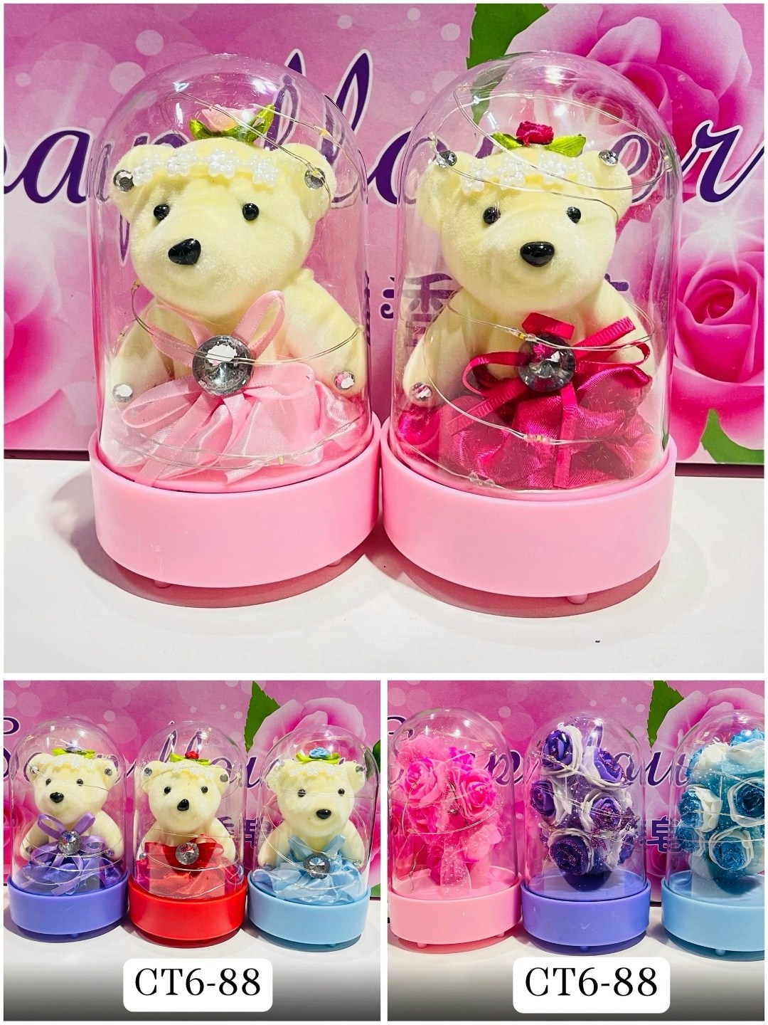 Милый плюшевый медвежонок в прозрачной колбе - это и полезный предмет, и выразительный элемент интерьера, и простой способ выражения своих чувств Маленькая медведица в яркой атласной юбочке, украшенная мерцающими стразами, жемчужными бусинками и аккуратным тканьевым цветком, вызывает прилив положительных эмоций Колба-подставка со светодиодной лентой служит стильным оформлением для игрушки, и одновременно - лампой-ночником с теплым приглушенным цветом.