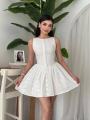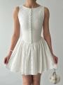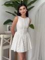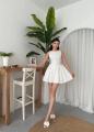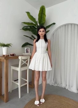 Нежное мини-платье из белого хлопкового кружева, подчркивающее талию и создающее воздушный, кукольный силуэт Плотный лиф с аккуратной пуговичной линией и пышная юбка с вышивкой делают образ свежим, романтичным и очень женственным.