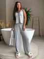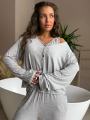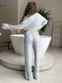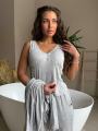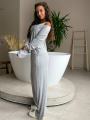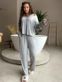Серый lounge-сет из струящейся тканьи: расслабленный кардиган с открытым плечом, лаконичный топ и свободные брюки на мягкой резинке Идеальный баланс комфорта и чувственной посадки для дома, города и моментов для себя.