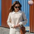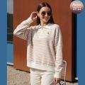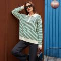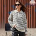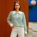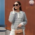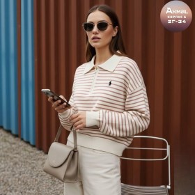 Женский свитер поло в полоску с короткой молнией на воротнике и гольф-эмблемой это воплощение утонченного стиля и шарма дарит непревзойденный комфорт и становится элегантным акцентом, добавляя образу легкую игривость и вариативность.