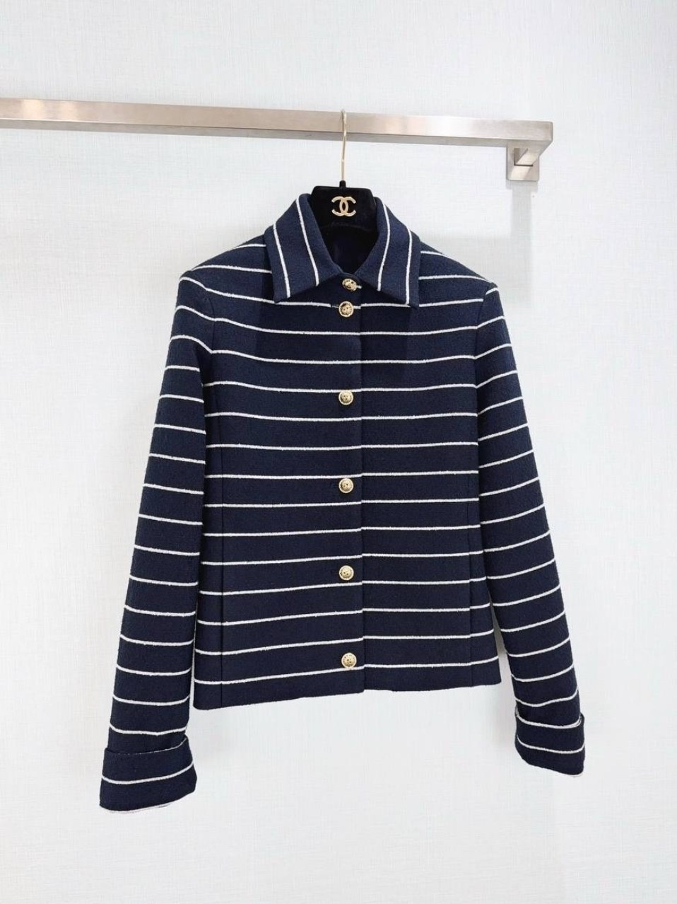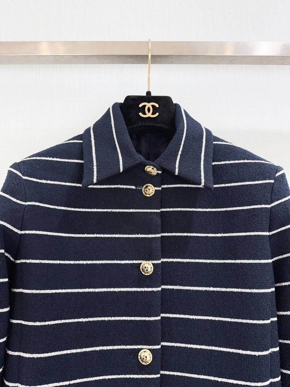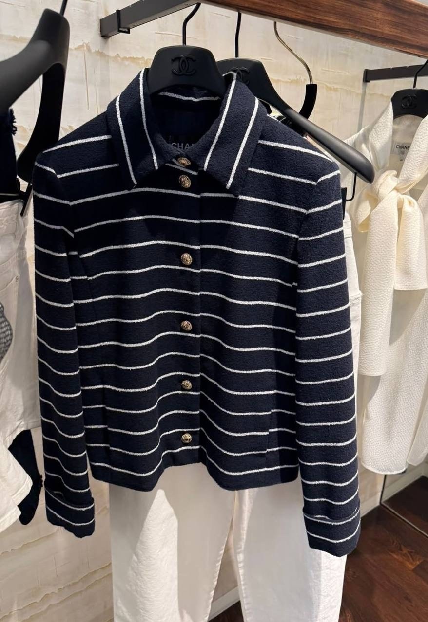 Жакет и брюки, где каждая деталь говорит о вашем безукоризненном высоком вкусе Темно-синий, украшенный тонкой белой полоской, классика, всегда актуальная Воздух хлопка и гладкость шелка для максимального комфорта Золотая фурнитура ваша подпись стиля.