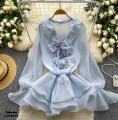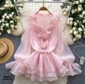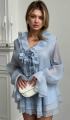 Двойной волан вокруг выреза создает эффект воздушности и легкости, визуально увеличивая объем в верхней части фигуры.