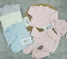 В набор входит 4предмета с наружнымы швами: распашонка,ползунки чепчик и платок Рукава на распашонка закрыты ( есть возможность их открыть).
