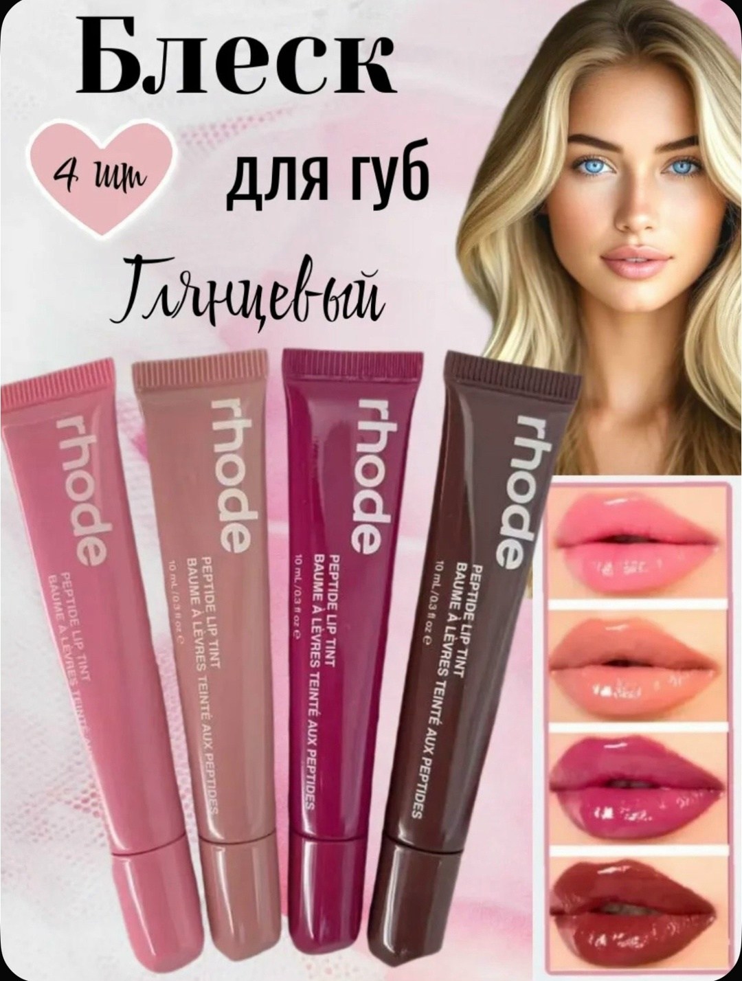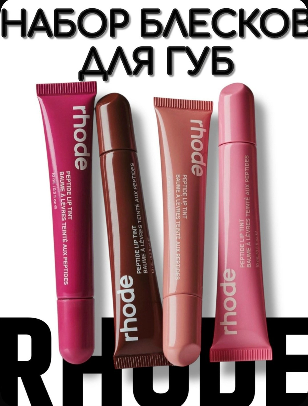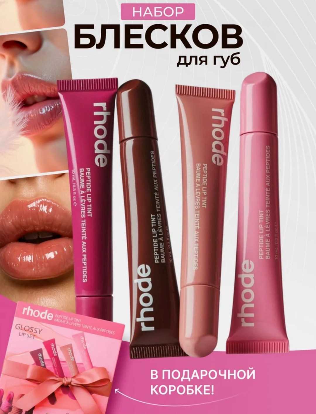 Набор rhode станет идеальным подарком Его ухаживающая пептидная формула обеспечивает интенсивное увлажнение и наджную защиту от сухости Она делает губы гладкими и ухоженными Прозрачный блеск с лгкой текстурой придает зеркальный глянцевый финиш и визуальный объем без липкости Удобный аппликатор-тинт обеспечивает комфортное и легкое нанесение Идеально подходит для ежедневного макияжа Подчеркивает естественную красоту и создат ощущение комфорта в любую погоду.