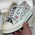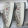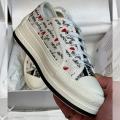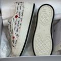 Кеды диор выделяются среди других моделей своим уникальным и неповторимым стилем, который без труда преображает образ владелицы Элегантность, изысканность и гламурный дизайн излучают роскошь и класс Белые текстильные кеды украшены чрными надписями и красными сердечками Обувь поставлена на плоскую подошву из каучука с высоким рантом, а резиновая вставка защищает мысок от повреждений.