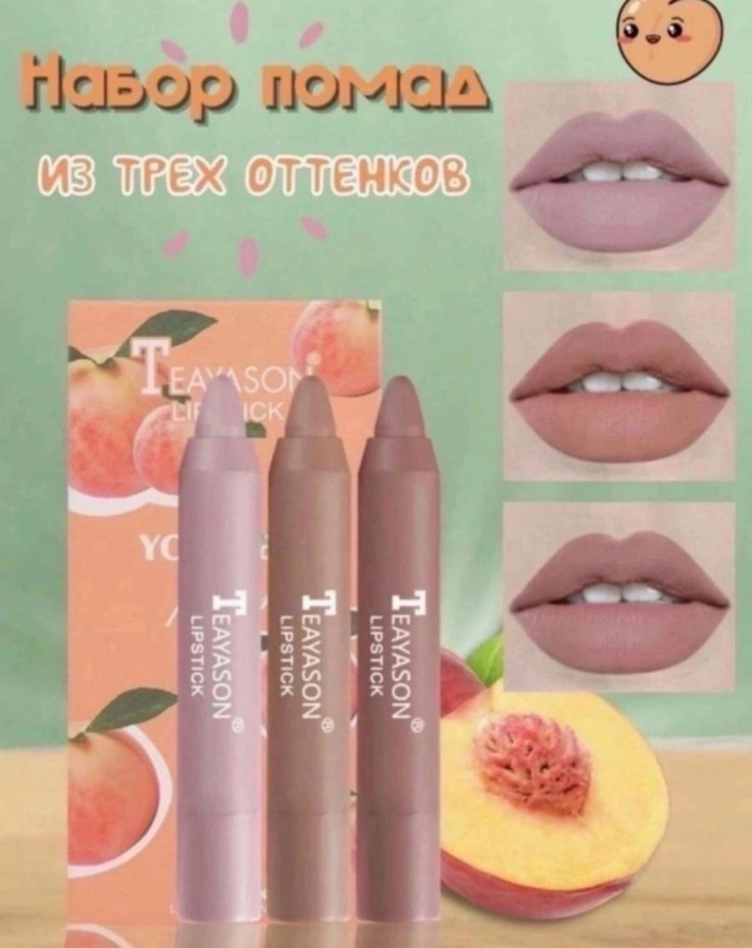 Набор суперстойких помады от teayason состоит из 3 матовых нюдовых оттенков Бархатная нежная текстура помады насыщена питательными элементами которые интенсивно увлажняют и защищают кожу губ, придают ей мягкость и эластичность Тинт имеет форму карандаша, это позволяет создать четкий ровный контур при нанесении Помада - карандаш имеет удобный выдвижной механизм, вам не придется использовать точилку Тинт обладает непревзойденной стойкостью, держится на губах длительный период и легко переносит перекус Увлажняющая матовая помада в трех супертрендовых оттенках это настоящая находка для каждой женщины, вы можете менять образ по настроению и всегда оставаться ослепительной Уникальная формула на основе пчелиного воска и масел деликатно ухаживает за вашими губами и защищает от сухости и обветривания в течение дня Набор тинтов это отличный подарок для женщин на 8 марта или день рождения, такой подарочный набор по достоинству оценит каждая женщина Набор помад сделает твой образ неповторимым.