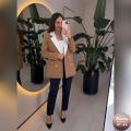 Мастерски скроенный, этот пиджак обладает идеальной посадкой, подчеркивая достоинства фигуры Лацканы, выполненные из тканьи другого цвета, придают изделию уникальность и характер Этот контрастный акцент не только добавляет изысканности, но и визуально удлиняет шею, обрамляя лицо, словно драгоценная оправа.