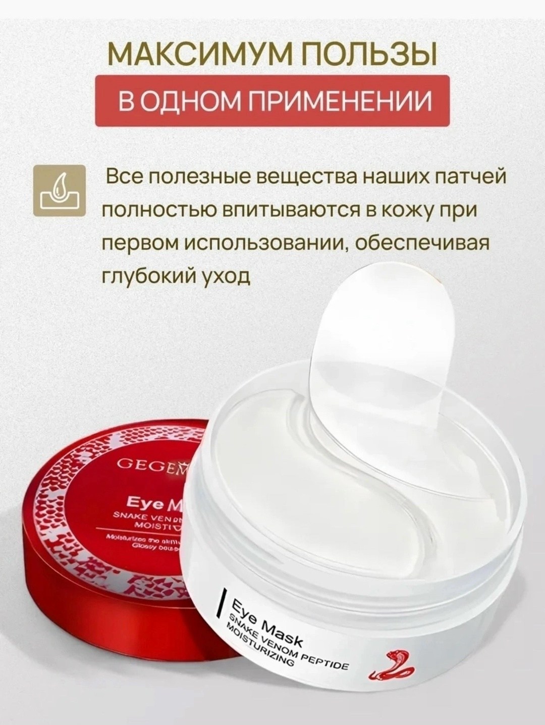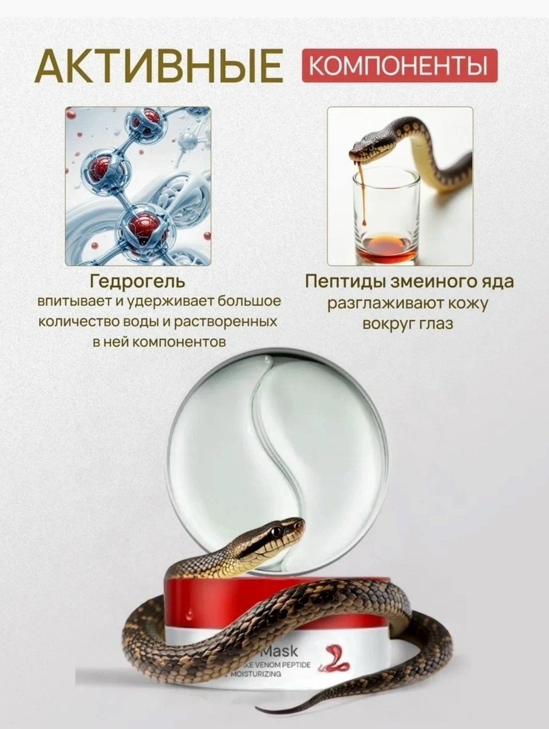 Патчи обеспечивают глубокое увлажнение кожи и замедляют процессы старения В их составе содержится пептид змеиного яда, коллаген и гиалуроновая кислота, необходимые для восстановления упругости и эластичности.
