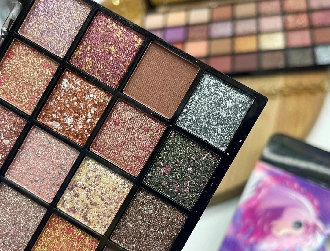 В палетке великолепно сочетаются как матовые оттенки, так и тона с блстками, для создания ярких образов.