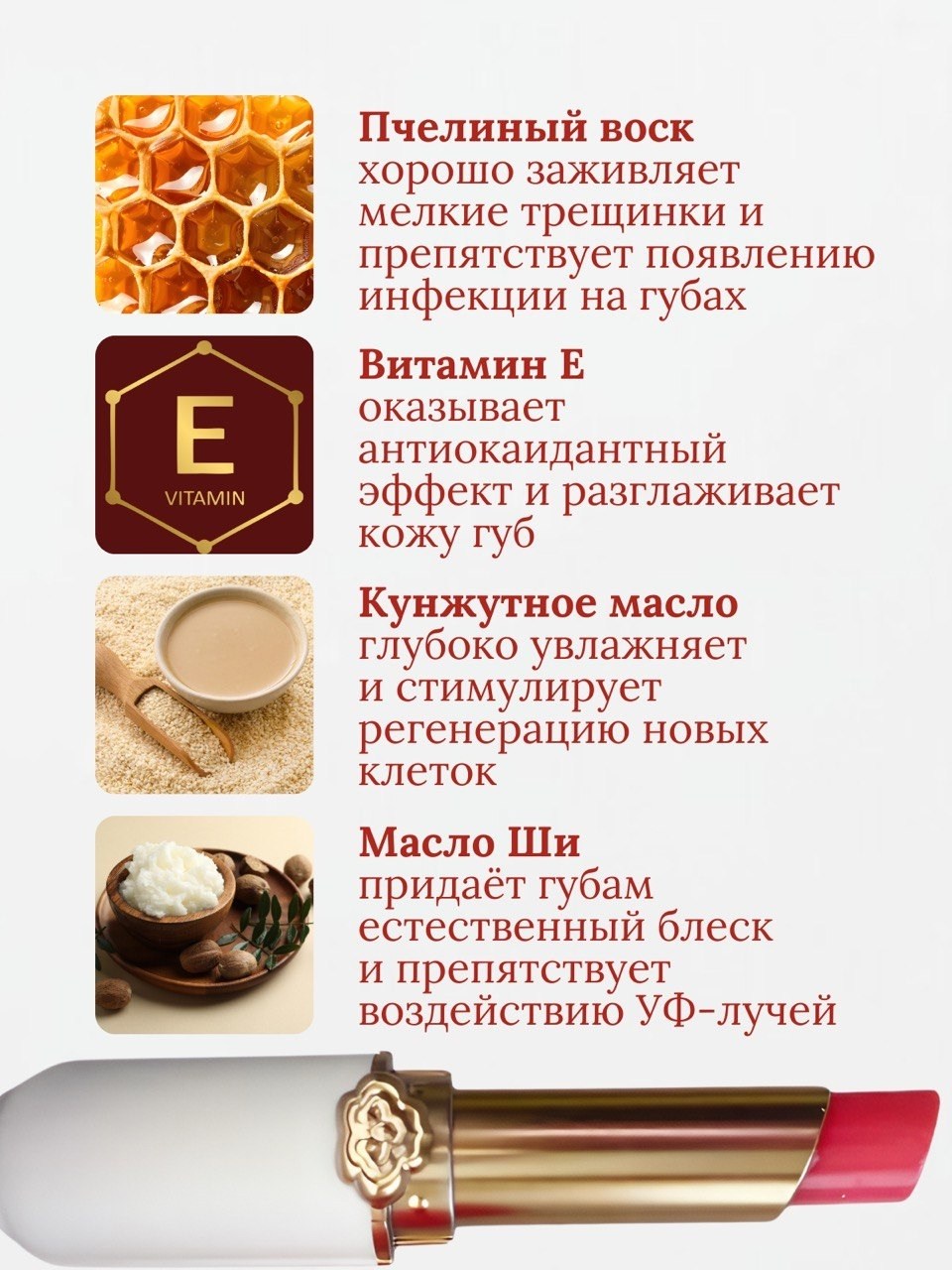Гигиеническая помада-тинт для губ от omga - это быстрое спасение для сухих, обветренных, покрасневших губ Питательный, увлажняющий бальзам корея, блеск, тинт для губ omga питает кожу, устраняет сухость и заживляет трещинки С первого нанесения бальзам для губ дает ощущение комфорта, быстро избавляет от ощущения стянутости и сухости Благодаря натуральному составу гигиеническая помада разглаживает, регенерирует и увлажняет кожу губ, ускоряет заживление трещинок Не содержит силиконов и минеральных масел и подойдет для детского и подросткового ухода Идеальна для зимнего и весеннего периода года Корейский блеск для губ создает эффект влажных губ У гигиенической помады оригинальный дизайн Благодаря подарочной упаковке розовый тинт для губ отлично подойдет в качество подарка на день рождения Гигиеническая помада, благодаря легкому скольжению, нежному аромату и тающей, не липкой консистенции превращает обычный уход в истинное наслаждение Губы отлично смягчены, разглажены, защищены и выглядят просто великолепно В состав бальзама входят витамины, питательные вещества, белки, антиоксиданты и полезные жиры Средство одобрено экспертами и подходит для повседневного применения в любое время года Применение: наносите бальзам на кожу губ тонким слоем, обновляйте бальзам на губах по мере необходимости.