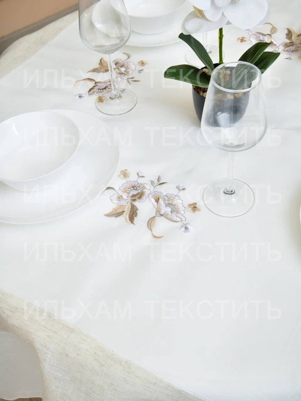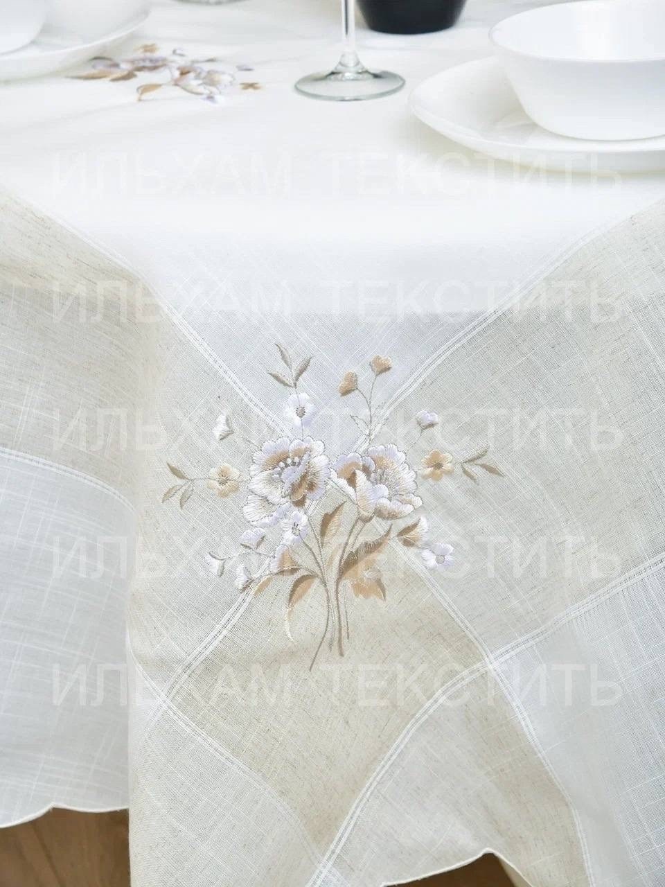 Скатерть лн с вышивкой качество очень хорошее с добавкой с полеэстер стирается хорошо в подарочной сумке.