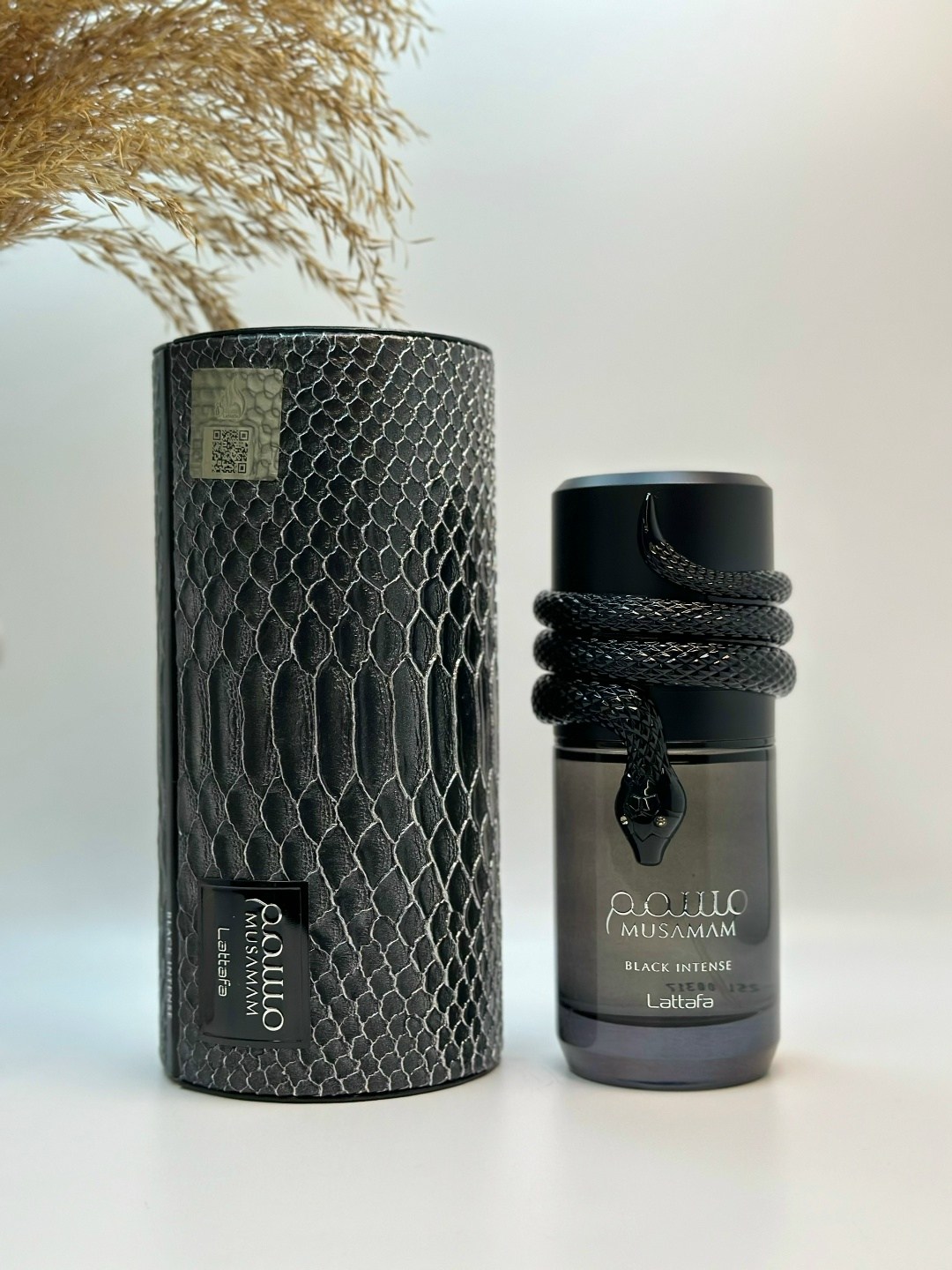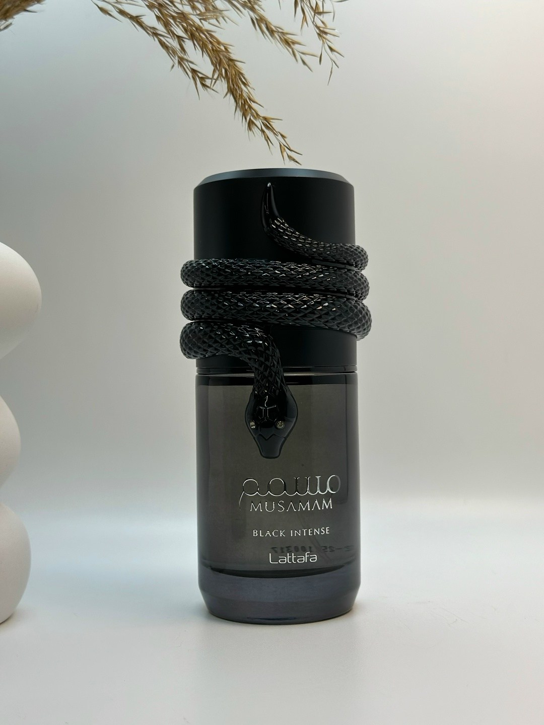 Темный дымчатый флакон lattafa musamam black intense украшен элегантным скульптурным изображением черной змеи, обвившей колпачок.