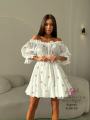 New легкое и воздушное платье с вишневым принтом Присборенная талия подчеркивает фигуру, а открытые плечи придают образу соблазнительность Рукава-фонарики с кружевной отделкой добавляют романтичности.