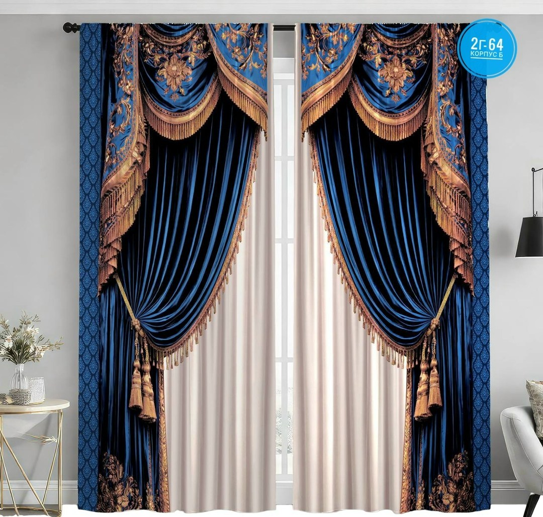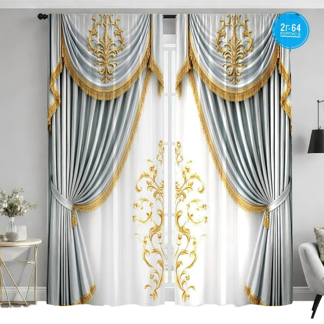 В комплекте идут 2 полотна Размер каждого полотна 150х260см, общие габариты комплекта штор 300х260см Пришита шторная лента 6 см на которую сразу можно повесить занавески на крючки, карнизы для штор, трубу.