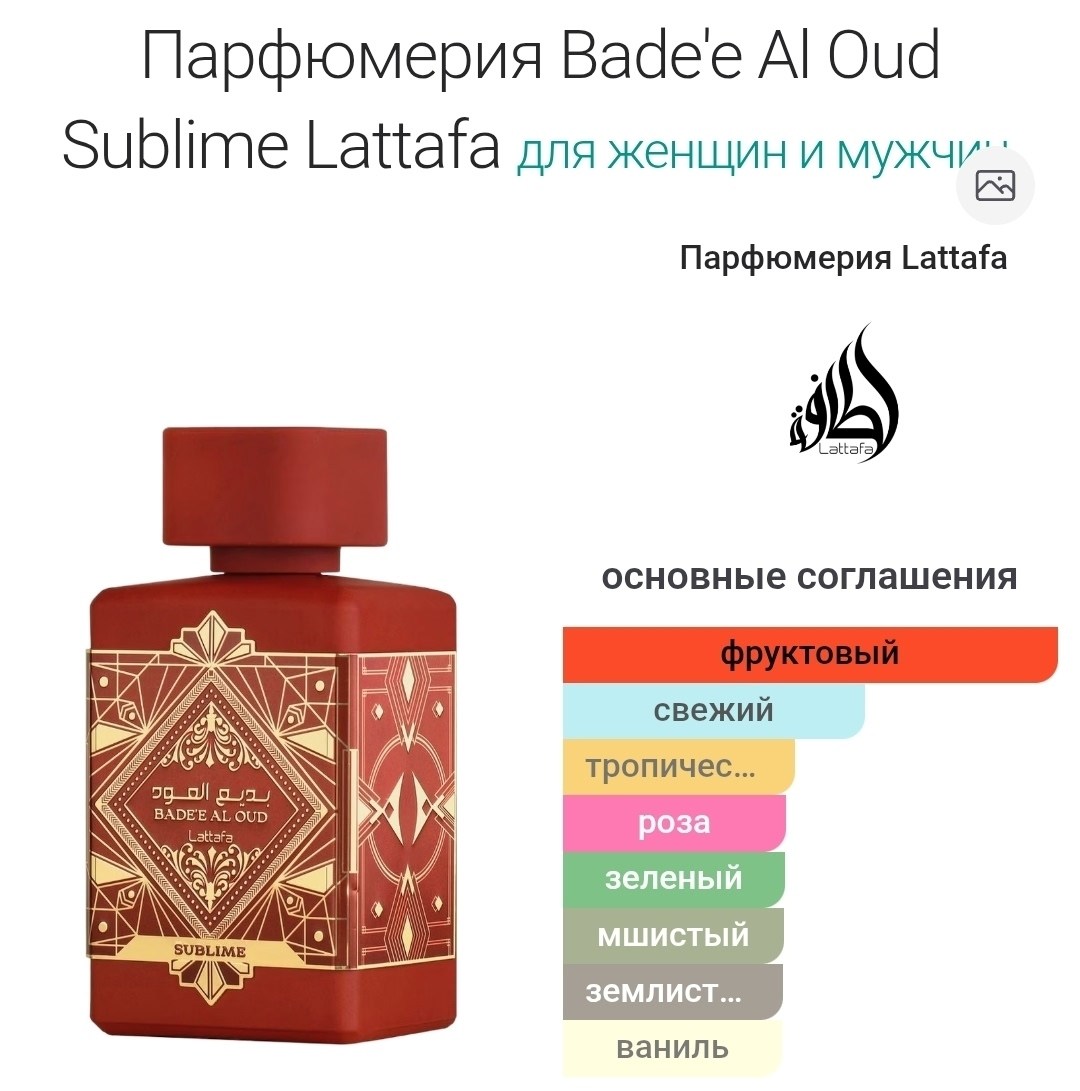 Badee al oud sublimeотlattafa perfumes это древесно-ароматический аромат для женщин и мужчин badee al oud sublimeбыл выпущен в 2023 году Верхние ноты: яблоко, личи и роза; средние ноты: слива и жасмин; базовые ноты: мох, ваниль и пачули.