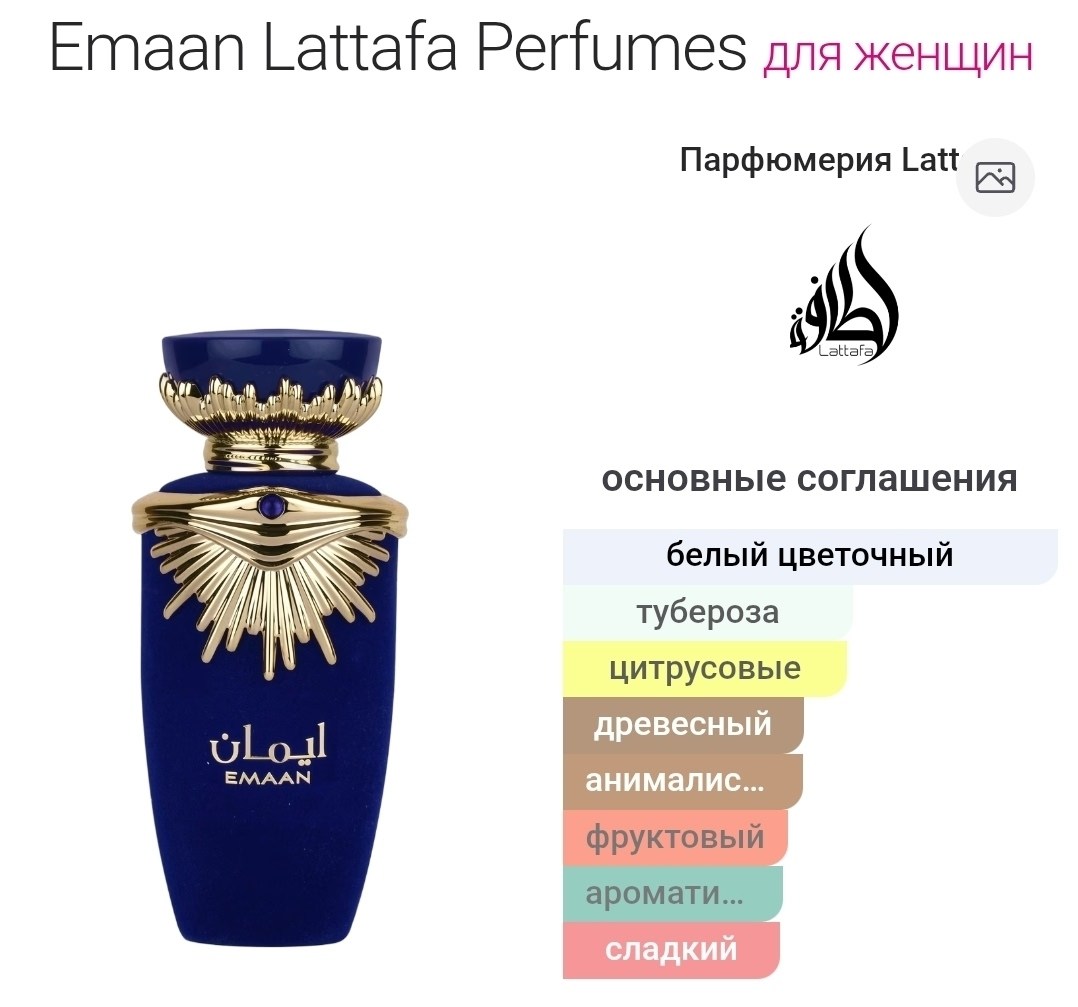 Emaanотlattafa perfumes это шипровый цветочный аромат для женщин emaanбыл выпущен в 2022 году Верхние ноты: цветок апельсина, бергамот и черная смородина; средние ноты: тубероза, жасмин и календула; базовые ноты: мускус, ваниль, кедр и пачули.