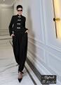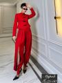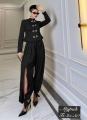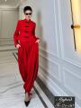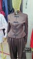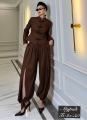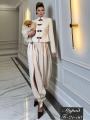 Этот элегантный костюм в восточном стиле состоит из приталенного жакета с воротником-стойкой и объемных брюк-шароваров.