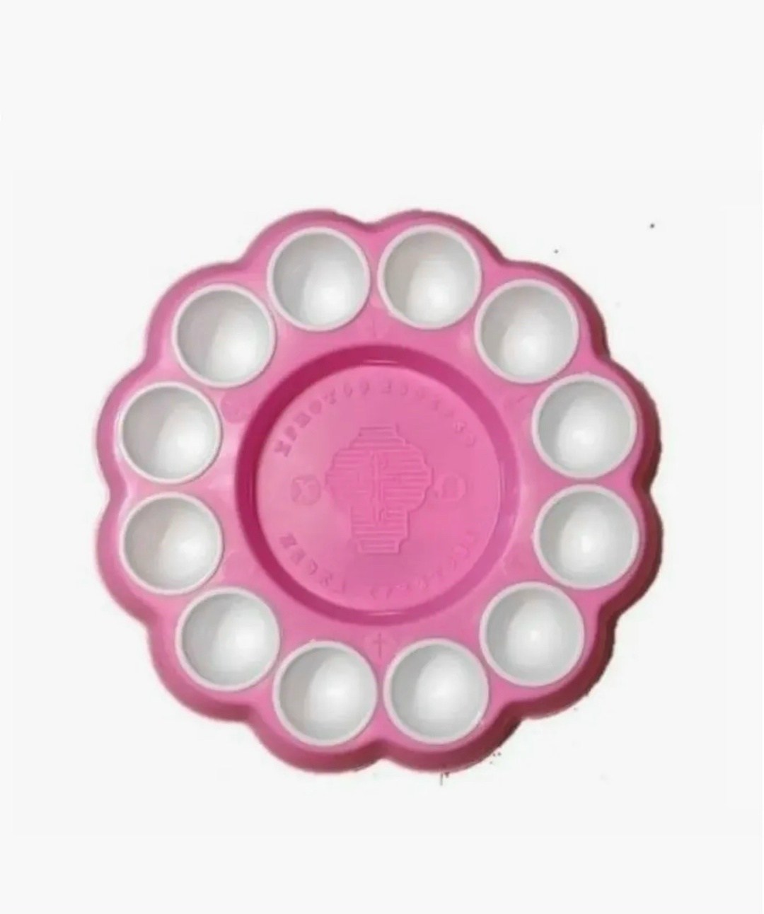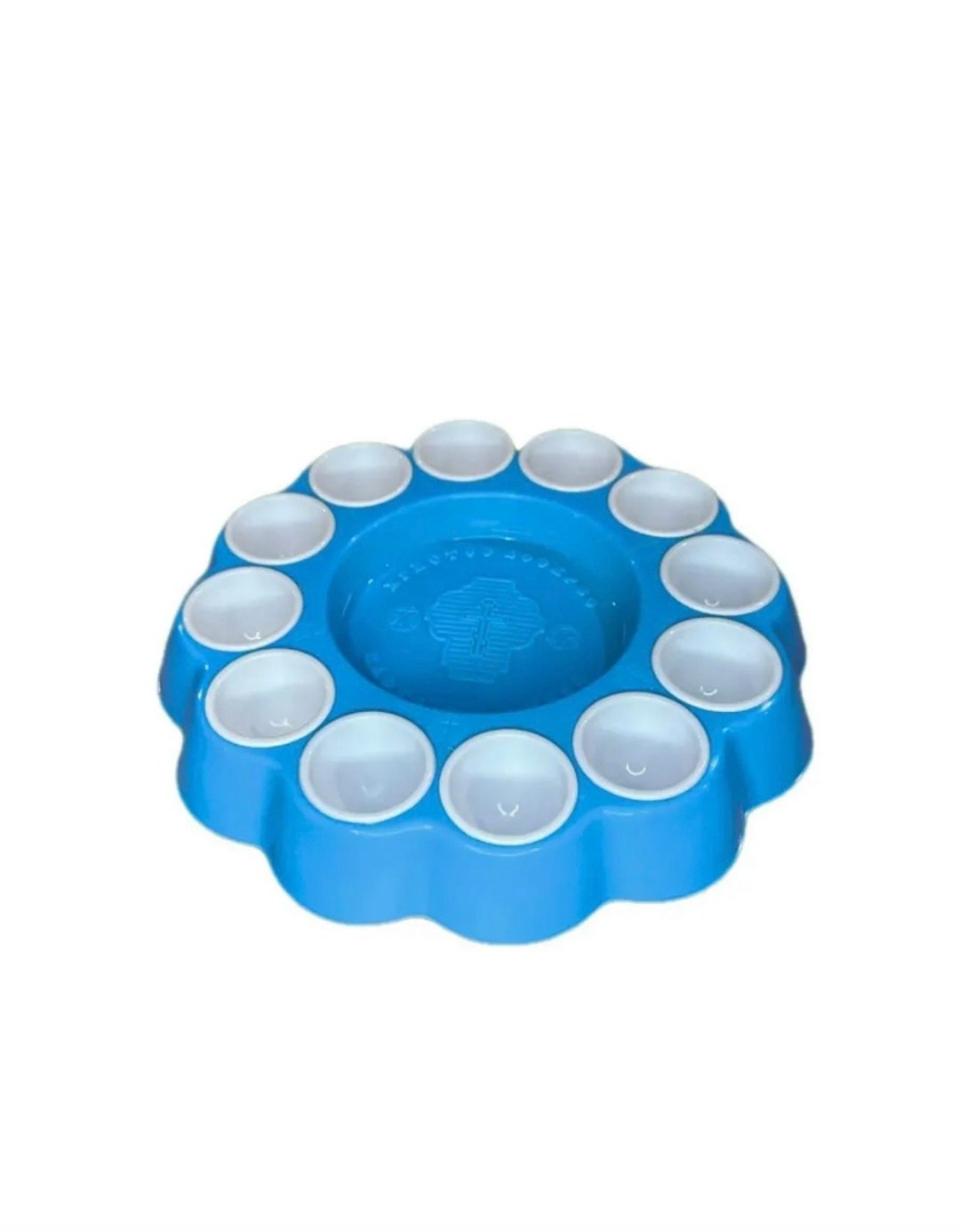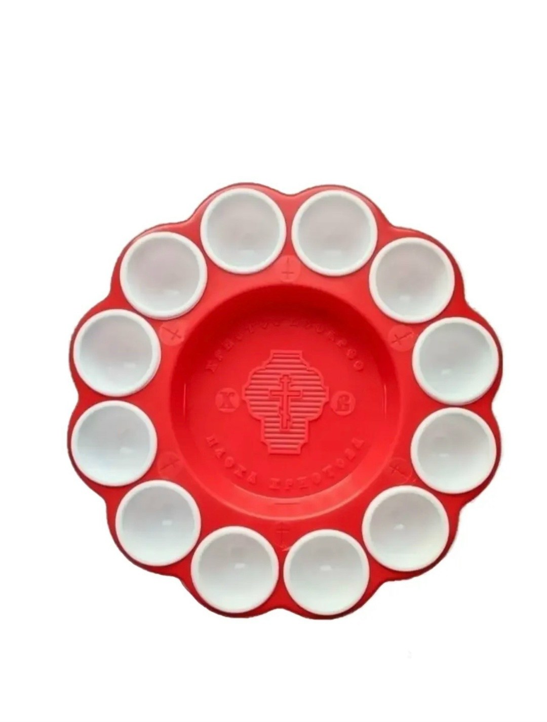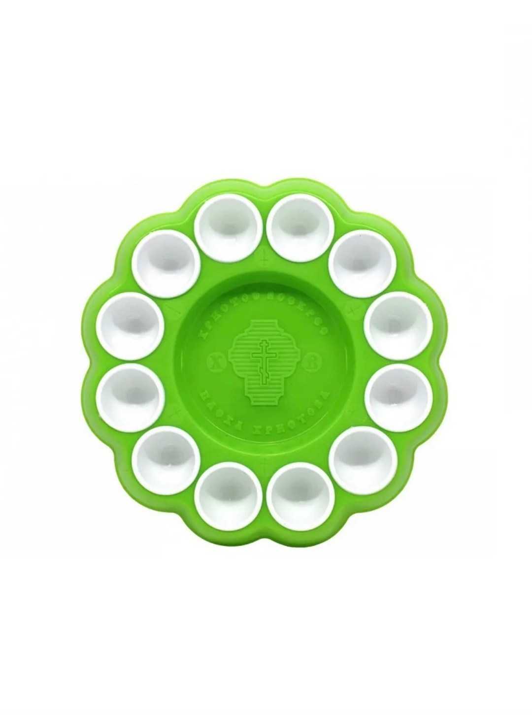 Подставка изготовлена из пластичного материала В центре изделия расположено углубление диаметром 12 см, предназначенное для кулича или пасхи По краю, по всему периметру располагаются глазки - углубления для 12 пасхальных яиц Эти углубления вставные и могут быть выполнены из пластмассы другого цвета Например, красная подставка с жлтыми или белыми глазками Она может быть использована при освящении пасхи, кулича и яиц, или при украшении пасхального стола.