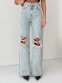 Светлые джинсы с высокой посадкой идеальный баланс дерзости и расслабленного шика Прямой широкий крой визуально вытягивает силуэт, а эффектные рваные детали на коленях добавляют образу характер и лгкий гранж-настрой Плотный деним держит форму, при этом остатся комфортным в носке.