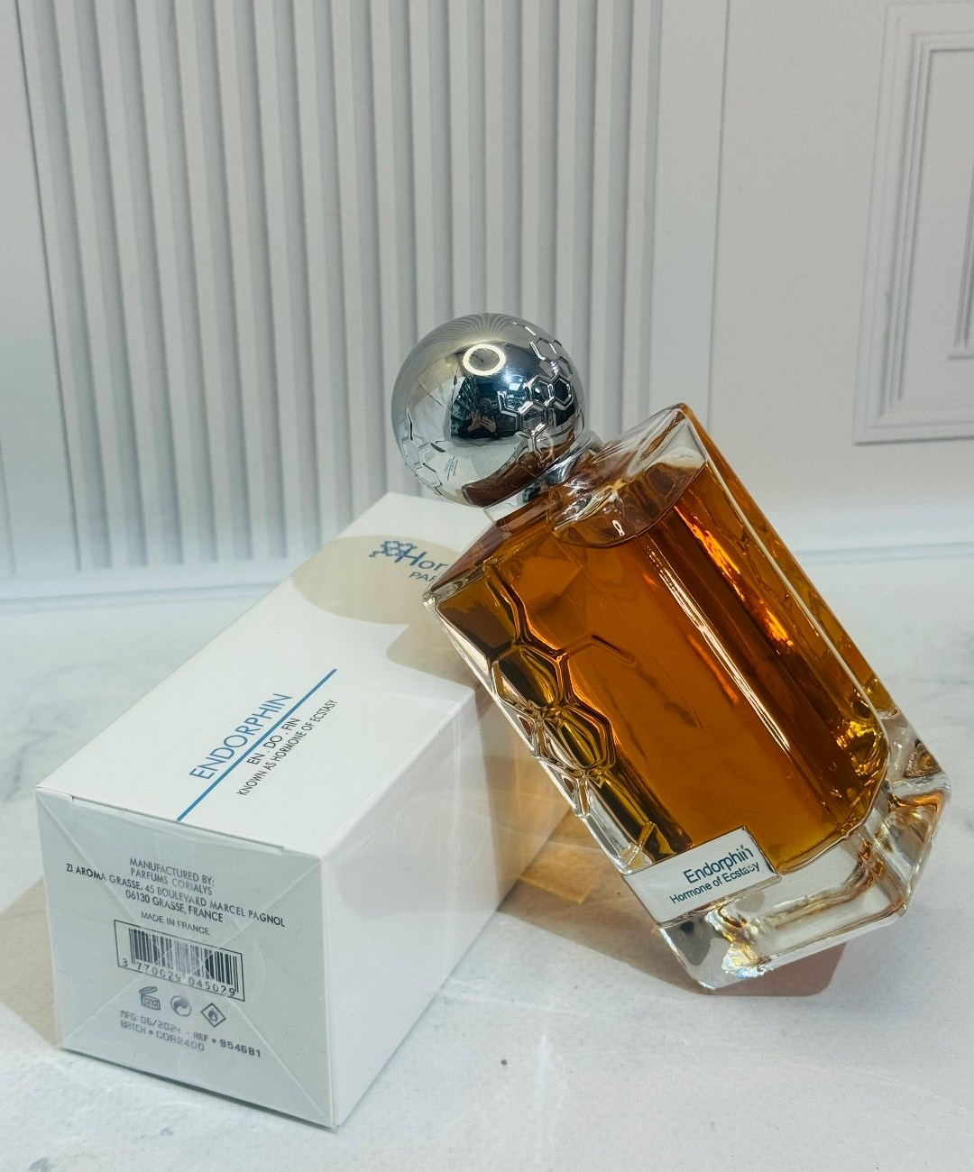 Флакон в минималистичном дизайне имеет особенность на его передней части выгравировано молекулярное строение гормона.