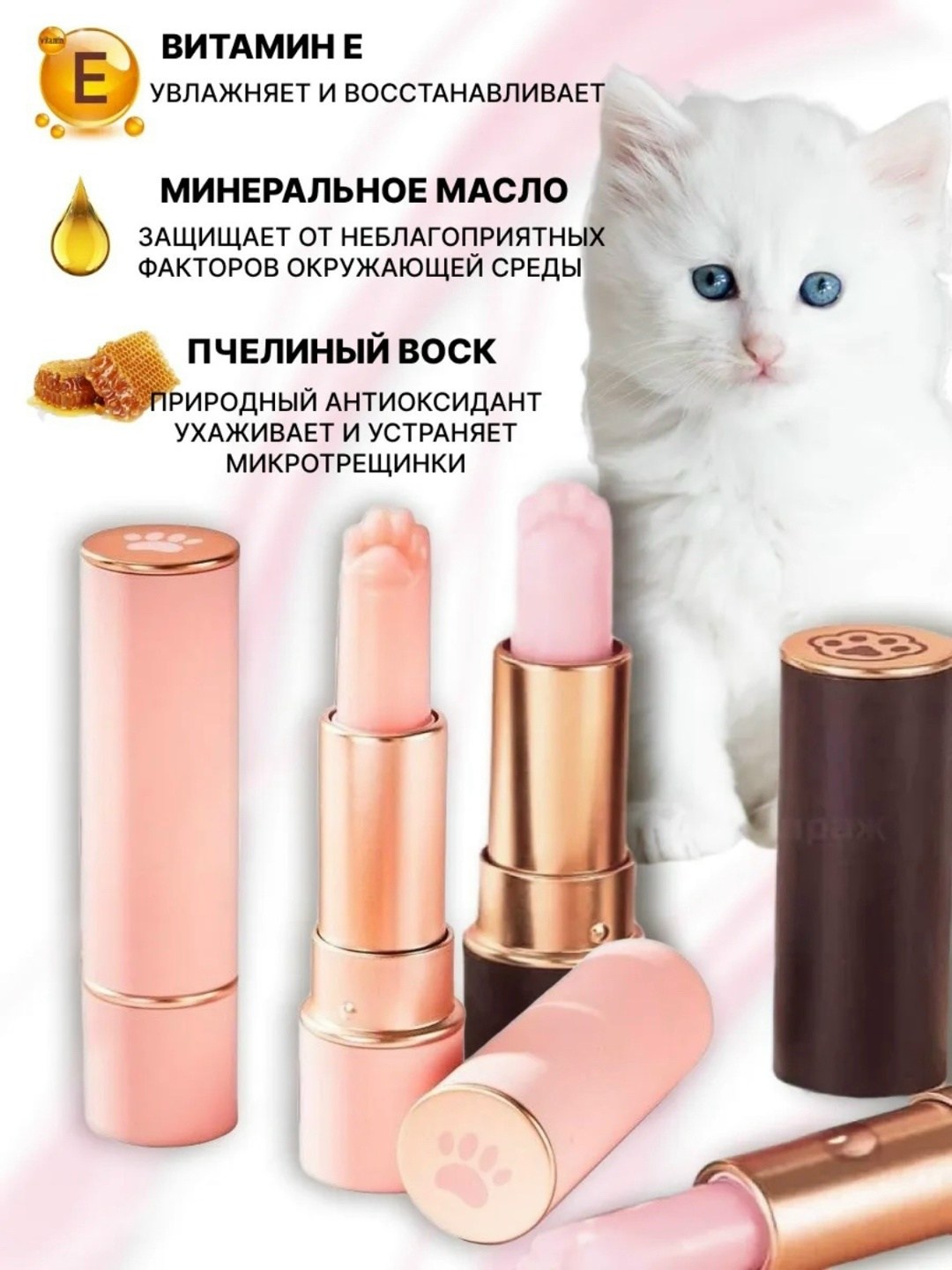 Набор милых гигиенических помад (2 шт) имеют форму кошачьей лапки У бальзамов стильный дизайн Оба бальзама прозрачные (без эффекта проявления) Обеспечивает защиту от сухости и обветривания Прекрасно подойдет для подарка или для вашей косметички Эти бальзамы для губ.