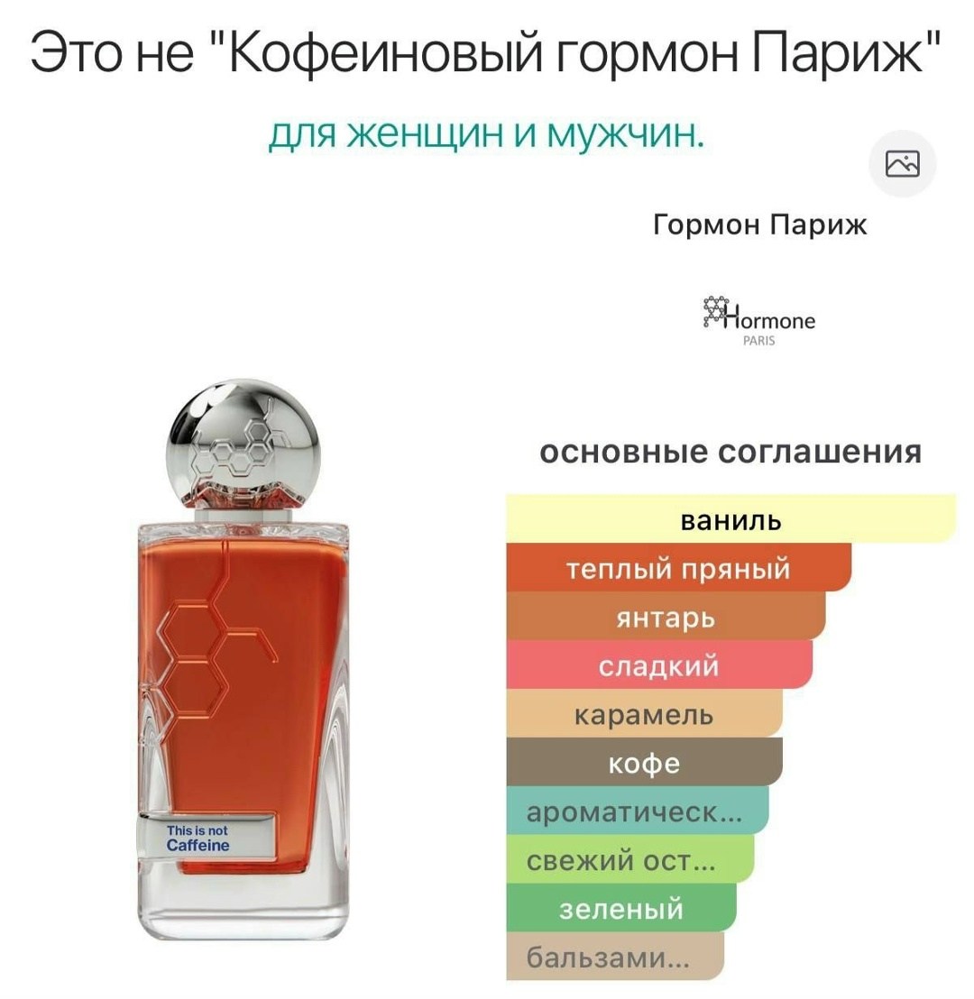 This is not caffeine от hormone paris это восточно-ванильный аромат для женщин и мужчин Это новый аромат, выпущенный в 2025 году Парфюмер, создавший этот аромат, шади самра Верхние ноты: карамель, перечная мята, корица, кокос и шалфей; средние ноты: кофе, бобы тонка, имбирь, жасмин и киприол; базовые ноты: абсолют ванили, бензоин, кедр, амбра и кожа.