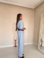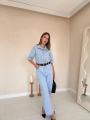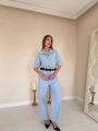 Джинсовый комбинезон: модель выполнена из денима светлой варки Верх напоминает классическую джинсовую рубашку с коротким рукавом, отложным воротником и накладными карманами на груди Брюки имеют свободный, прямой силуэт (wide-leg), что визуально вытягивает рост и делает фигуру более стройной.
