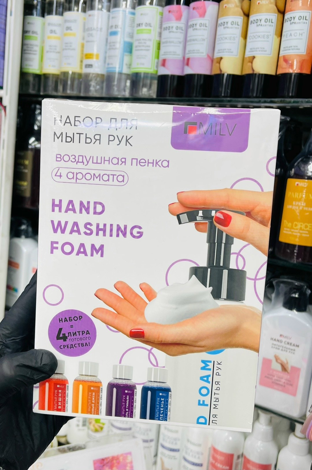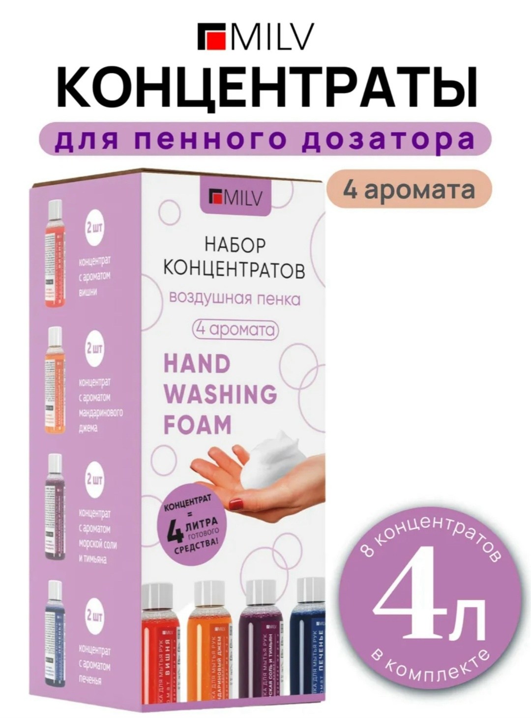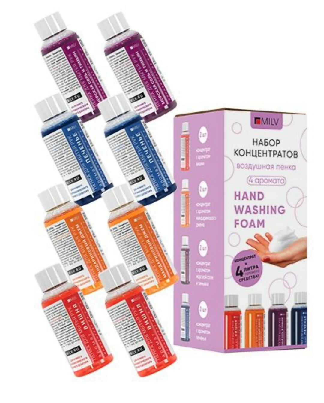 Набор косметического жидкого мыла пены от бренда milv, 8 концентратов, 4 аромата флакон с пенным дозатором в подарок.