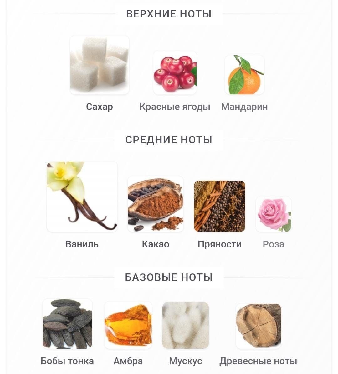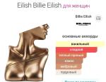Eilish верхние ноты: сахар, красные ягоды и мандарин; средние ноты: ваниль, какао, пряности и роза; базовые ноты: бобы тонка, амбра, мускус и древесные нот.