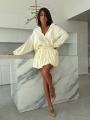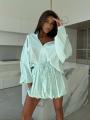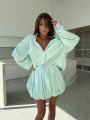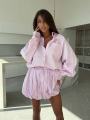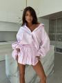 Этот костюм воплощение расслабленной роскоши и утонченности Легкая фактура тканьи с тонкой полоской придает образу свежесть, а свободный крой рубашки и пышная юбка создают воздушный, женственный силуэт.