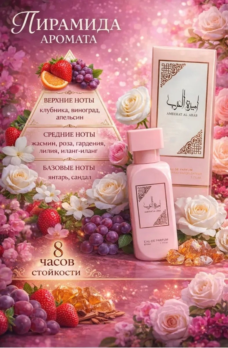 Ameerat al arab женский аромат, который воплощает в себе богатство и изящество арабских традиций Он создан для тех, кто хочет подчеркнуть свою женственность и загадочность через насыщенные цветочные и пряные ноты В центре композиции цветок жасмина, роза и амбра, создающие глубокое и притягательное звучание.