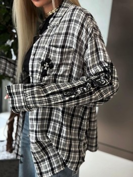 Стильная рубашка chrome hearts premium качества, выполнена в oversize-стиль, мягкий не мнущийся хлопок, со стразами, отложной ворот, в комплекте запасная пуговица и стразы.