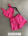 Боди с высокими разрезами, застeгивается на кнопки; шорты высокие посадки, рабочие корманы.