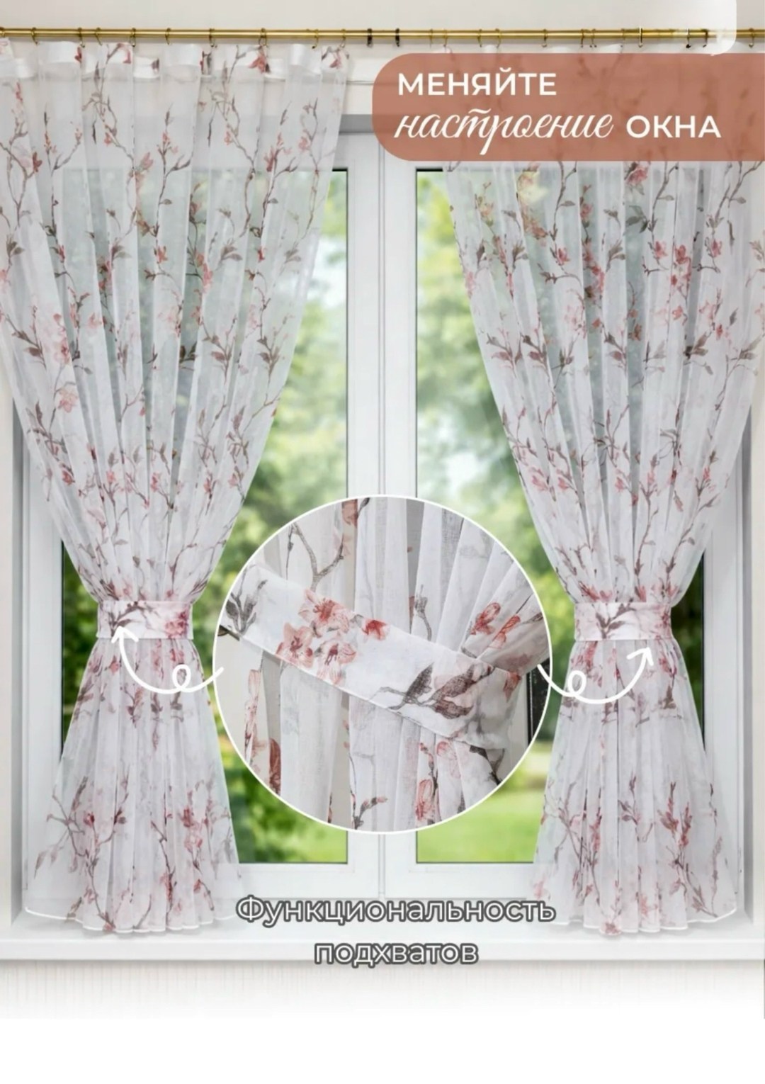 Новое поступление тюль на кухню и на балкона короткий с рисунком сакура с прихватка.