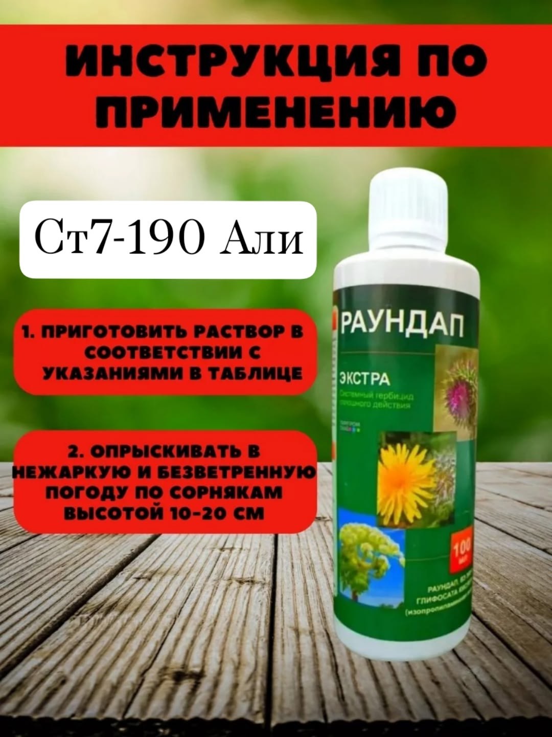 Раундап от сорняков 100 мл средство от сорняков, гербицид системного действия для уничтожения всех видов однолетних и многолетних сорняков Описание:раундап системный гербицид для уничтожения одно и многолетних сорняков (будяка, осота, березки, пырея и многих других) При попадании на растение проникает через листья и другие зелные части растения, разносится по всем органам, в том числе и к корневой системе, задерживая восстановление фермента, который способствует росту и жизнедеятельности растения Сорняки полностью уничтожаются на протяжении 2-3 недель после обработки.