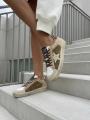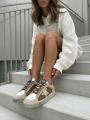 Кремово-бежево-белые низкие кеды stardan от golden goose с отделкой из наппы, пони, фирменной звездочкой по бокам, логотипом на язычке, кожаной шнуровкой спереди, круглым носком и плоской резиновой подошвой.