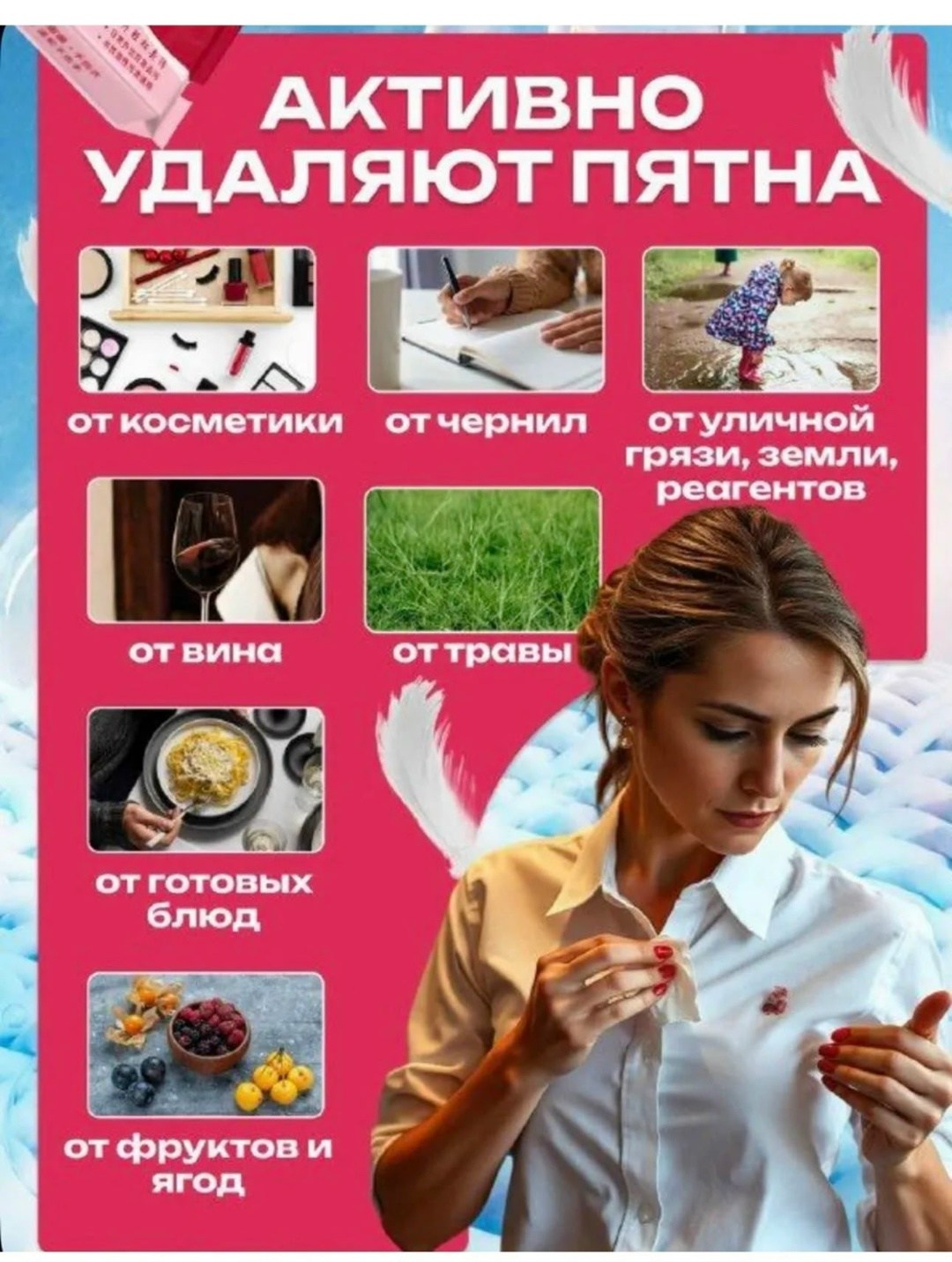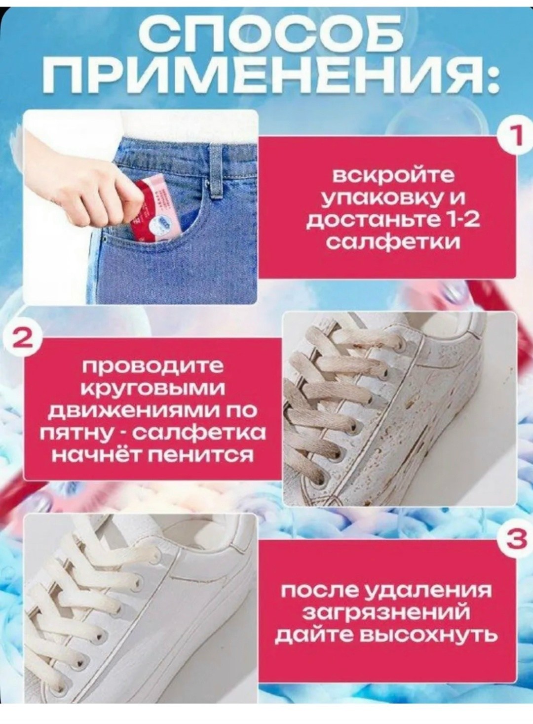 Салфетки против пятен для одежды - это универсальный набор для домашней химчистки и удаления пятен В него входят влажные салфетки с мягким очищающим средством, которые мгновенно удаляют пятна с белого и цветного белья, мебели, ковров и даже мягкой мебели Эти маленькие, мини но мощные салфетки являются лучшим помощником в борьбе с пятнами от пота, жидкого макияжа и других загрязнений Они также подходят для удаления пятен с верхней одежды, куртки, с пуховиков и меховых изделий без необходимости стирки или химчистки Эти китайские моющие средства являются безопасными для чистки детских вещей и могут использоваться как одноразовые салфетки для мгновенного удаления от всех видов пятен С нашими салфетками для одежды вы сможете легко и быстро очистить свою одежду, не прибегая к стирке или химчистке.