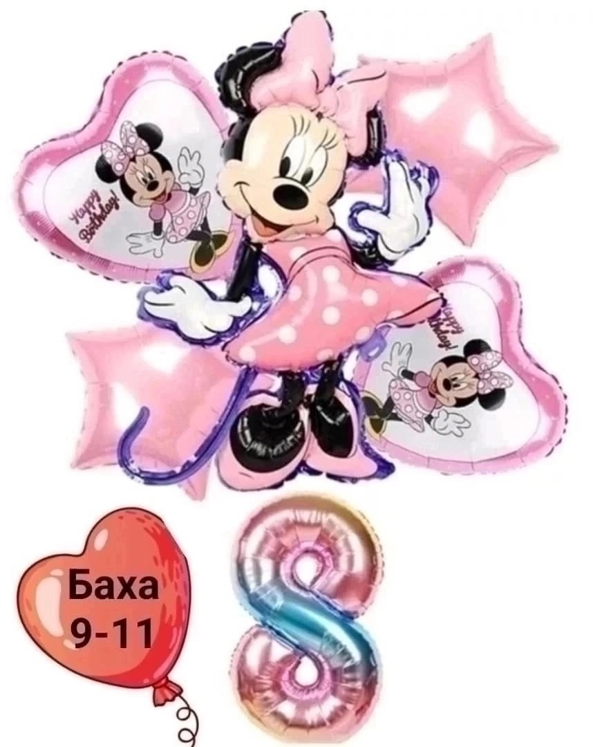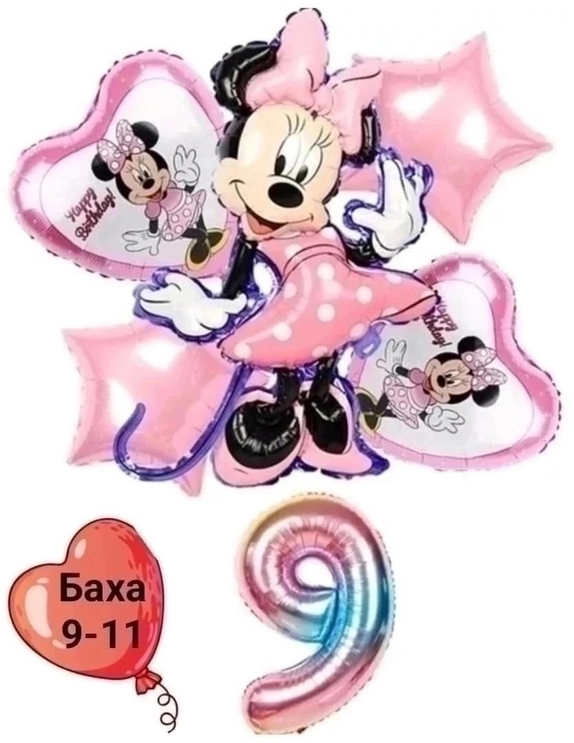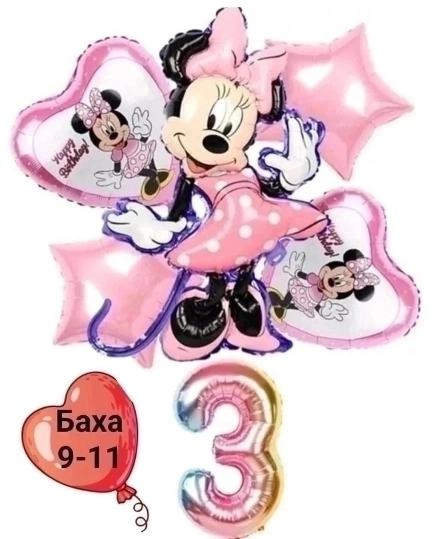 Набор фольгированных шаров минни мауса включает в себя: большая фигура и цифра 2 сердца с рисунками любимого супергероя 2 звезды и трубочка для надувания.