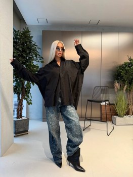Стильная рубашка balenciaga premium качества, выполнена в oversize-стиль, мягкий не мнущийся хлопок, что держит форму, со стразами, отложной ворот.