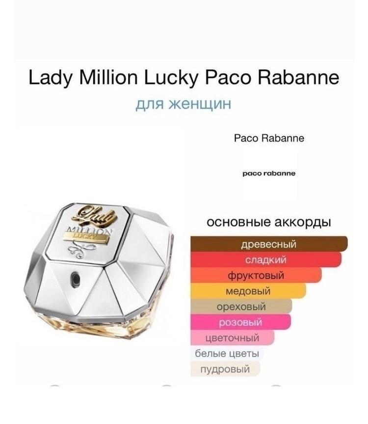 Флакон может поставляться без крышки, или в так называемой технической упаковке.......... Lady million lucky eau de parfum paco rabanne (копия) (в россии известен как леди миллион лаки), выпущенный в 2018 году, классифицируется как аромат для женщин и принадлежит семействам фруктовые и цветочные Lady million lucky eau de parfum входит в коллекцию 1 million lady million Состав композиции малина образует стартовый аккорд композиции, в сердце - фундук (лесной орех), роза и жасмин;базу составляет белый кедр, кашмеран, мд и сандал С ярким, энергичным и захватывающим ароматом paco rabanne lady million lucky леди миллион счастливица вы почувствуете себя на вершине блаженства и упоительной гармонии Цветочно фруктовый букет излучает невидимые волны интригующей нежности и позитива, сливаясь в единое целое со своей владелицей Он напоминает о солнечных летних днях и отдыхе на теплом песке, ласковых объятиях ветра и благоухании цветочных лепестков С ним так легко окунуться в атмосферу беззаботного веселья и зажигательных эмоций, даже если за окном кружат белые снежинки или барабанят крупные капли дождя.