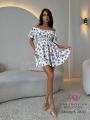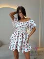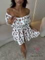 Шифоновое платье с цветочным узором Вырез кармен открывает плечи, украшен оборками Талия на резинке для комфортной посадки Многоярусная юбка создает воздушный и динамичный силуэт.