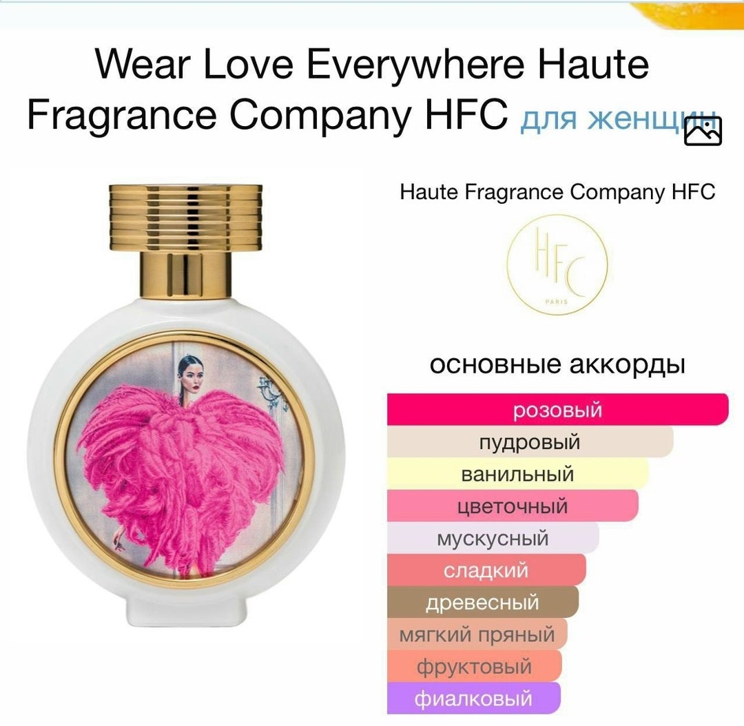 Hfc wear love everywhere это цветочно-фруктовый женский аромат 2017 года, созданный парфюмером винсаном рикором Он описывается как женственный, нежный и элегантный, с ведущей нотой розы, которая сочетается с розовым перцем и красными ягодами в верхних нотах В сердце аромата раскрываются магнолия, фиалка, розовая герань и ирис, а база состоит из мадагаскарской ванили, белого мускуса, сандала, амбры и лабданума.